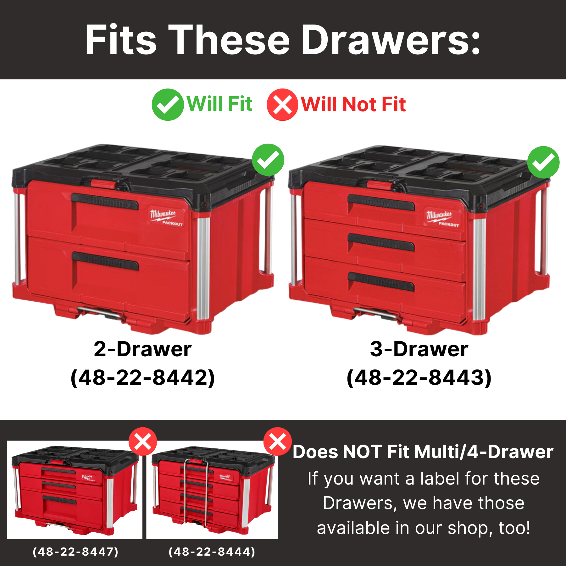 Our Drawer Labels make it easy to organize your PACKOUT drawers! Easily Identify what's in your drawers or set them apart at the jobsite! The Larger Drawer Labels (Picture 1) fit the following PACKOUT Boxes: