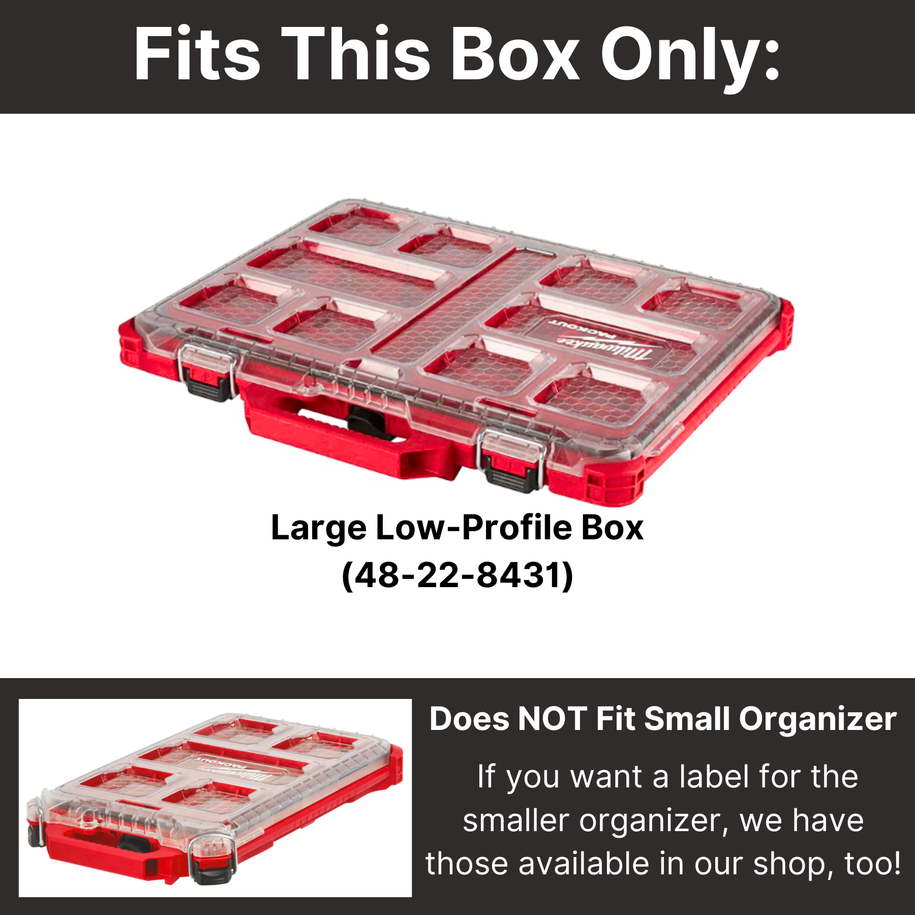 Tired of not being able to tell what's in your organizers? Label them! Visit our YouTube Channel for a full tutorial on how to install your new Label. They will fit the following PACKOUT Boxes: The Larger Labels fit the following PACKOUT Boxes: