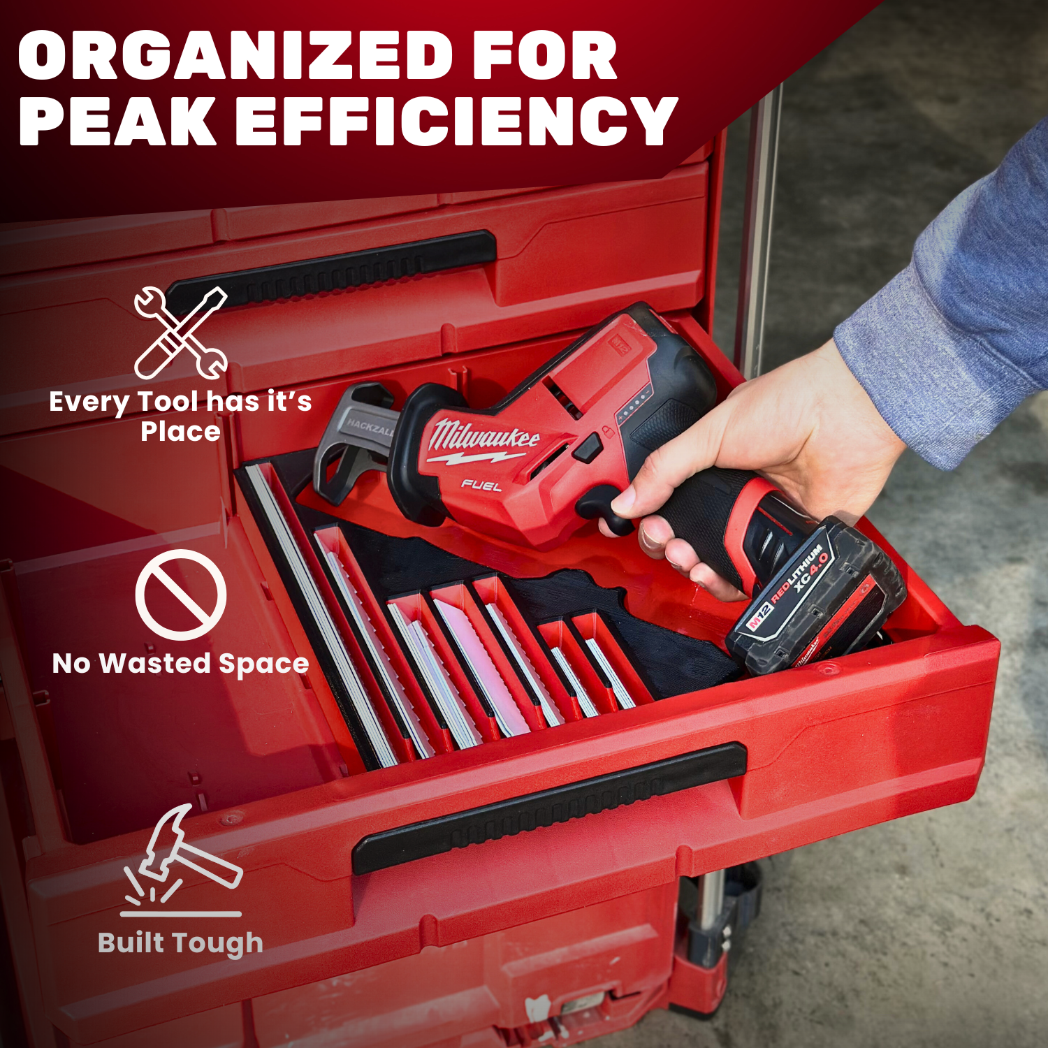 This kit is designed to organize the Milwaukee M12 FUEL Hackzall Reciprocating Saw (2520-20) in the Milwaukee PACKOUT 2-Drawer Tool Box (48-22-8442) or the 3-Drawer Tool Box (48-22-8443) & the BOTTOM Drawer of the Multi-Depth Drawers Tool Box (48-22-8447). It will hold plenty of 4, 6, 9, & 12 inch Sawzall blades! Visit our YouTube Channel for full tutorials on how to install the included Label for your new kit!