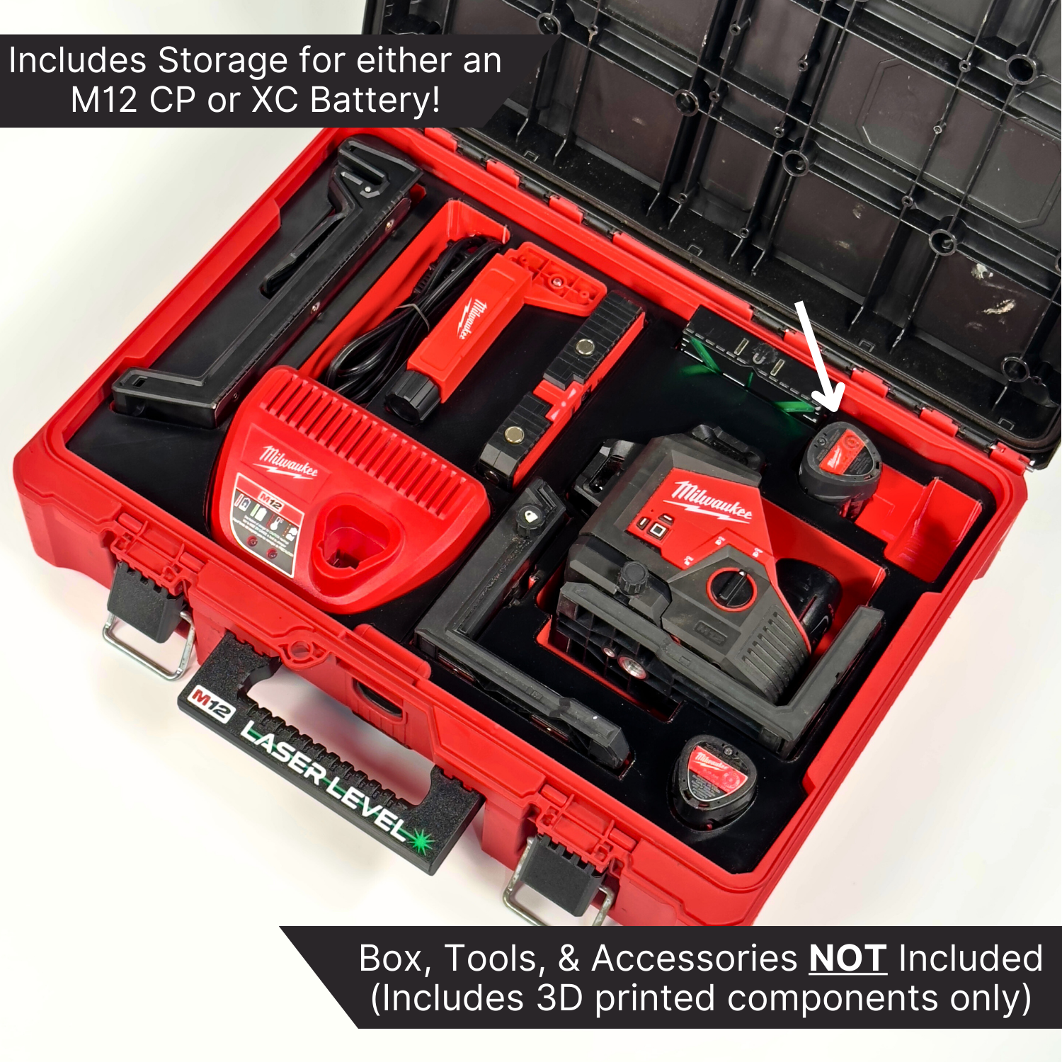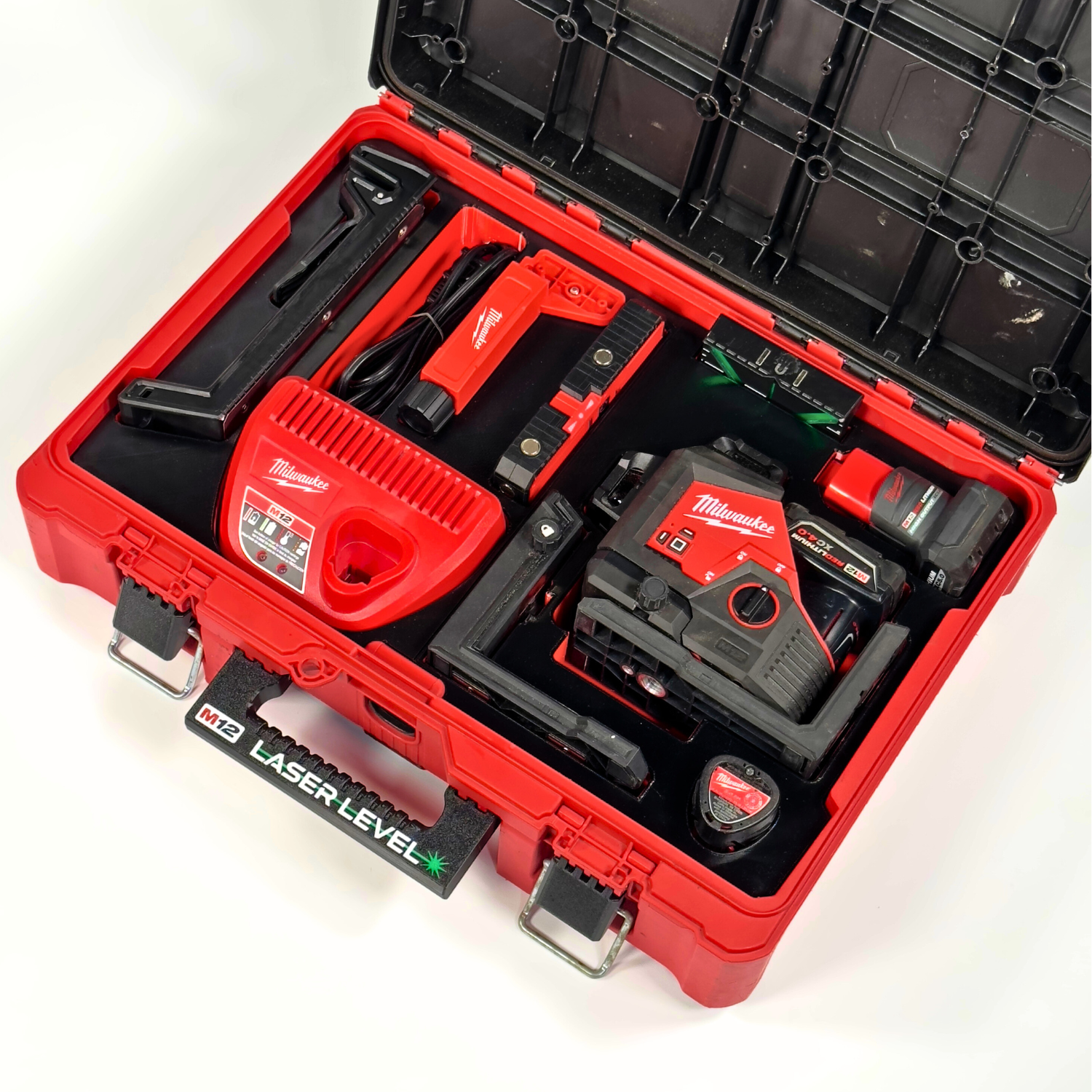 This Kit is designed to organize the Milwaukee M12 3-Plane Laser Level (3632-21) in the Milwaukee PACKOUT Tool Case (48-22-8450). It includes storage for most of the Milwaukee laser accessories including the laser line detector & clamp, quick connect laser mount, high-vis target card, track clip, M12 battery charger, & room for either a CP or XC M12 battery.
