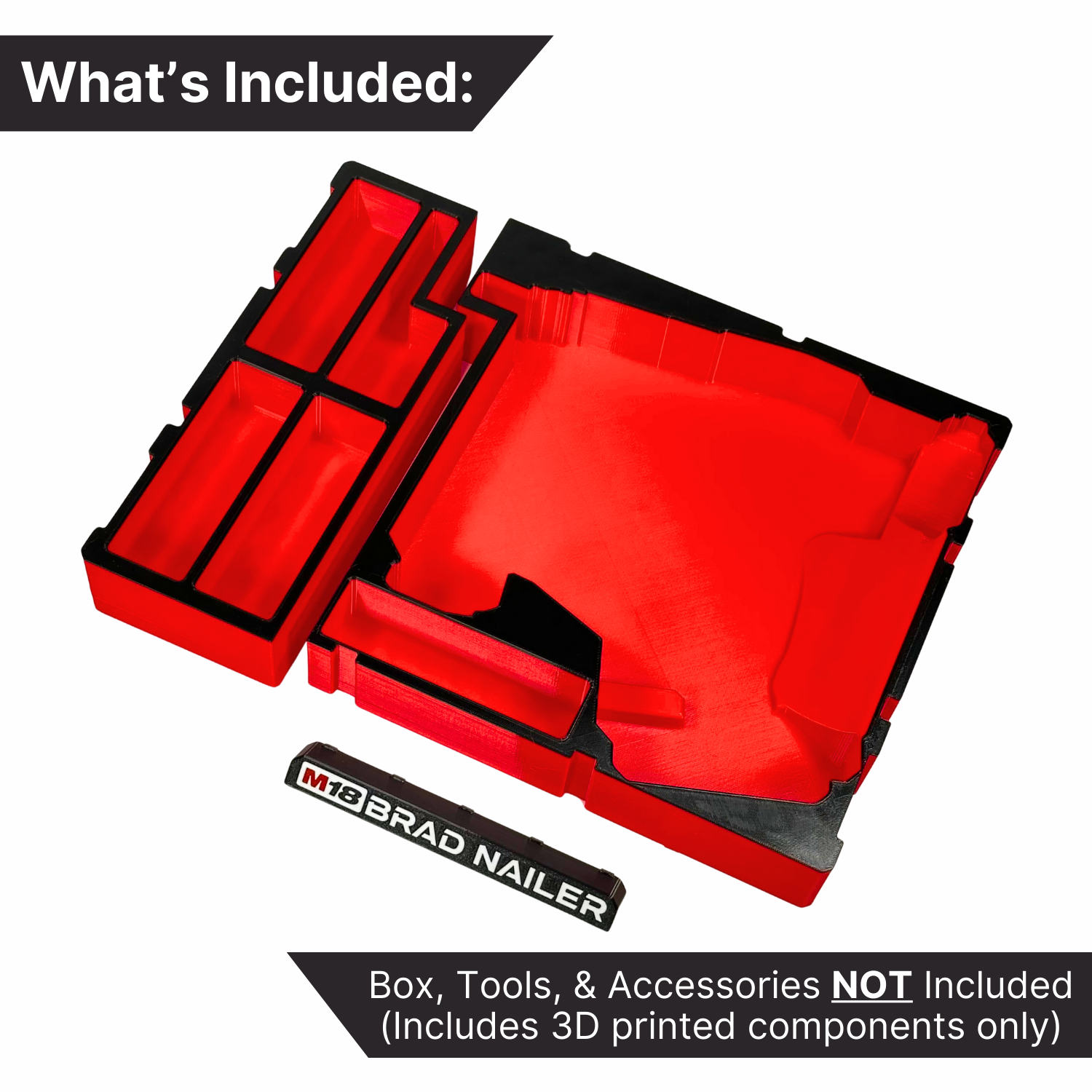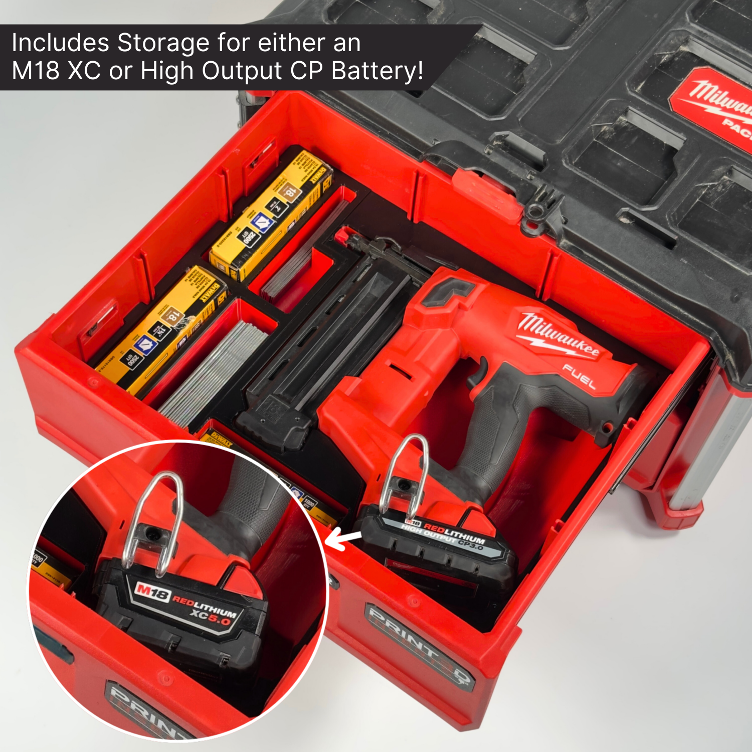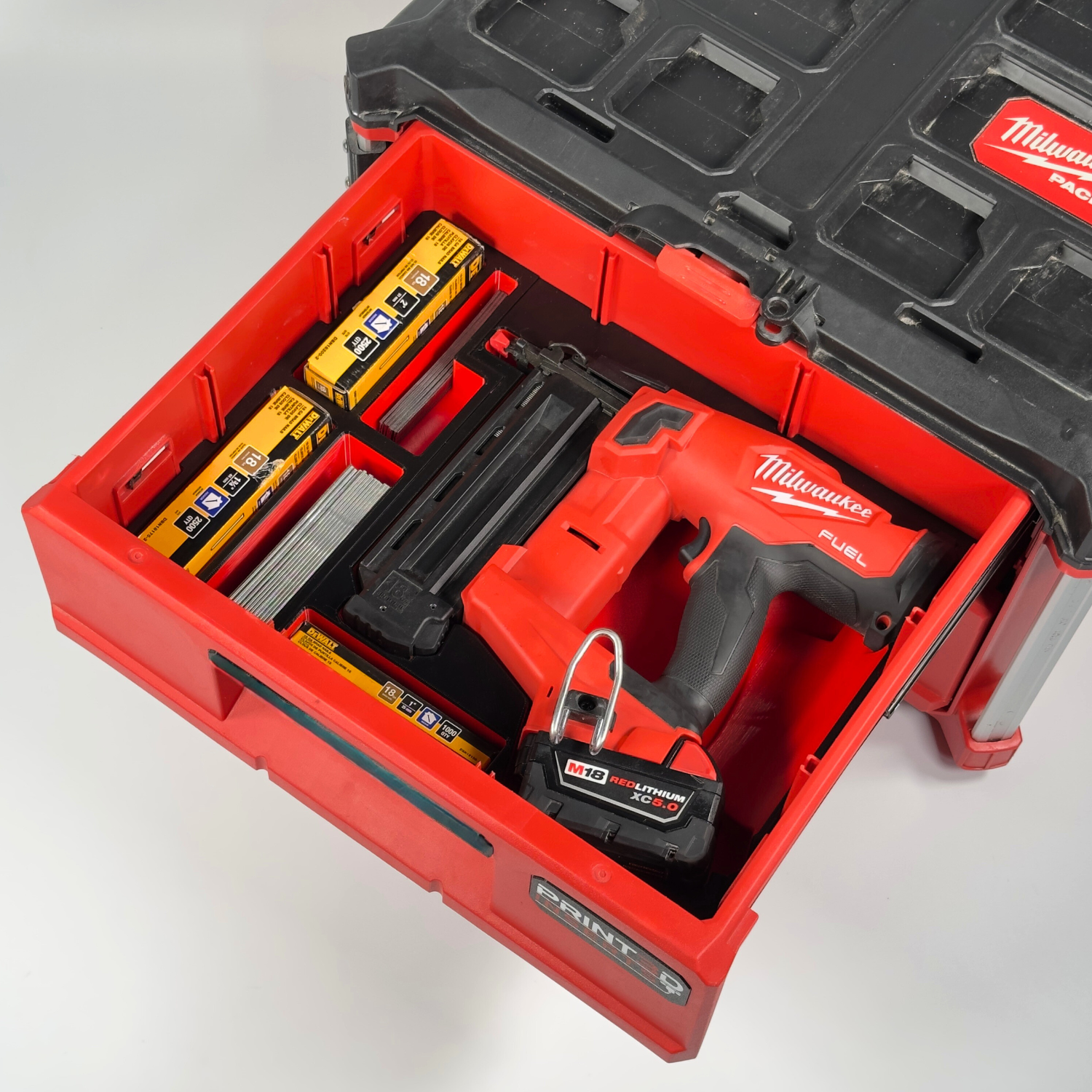 This kit is designed to organize the Milwaukee M18 Brad Nailer (2746-20) in the Milwaukee PACKOUT 2-Drawer Tool Box (48-22-8442) and the BOTTOM Drawer of the Multi-Depth Drawers Tool Box (48-22-8447). It also has room for an M18 XC size battery or a High Output CP 3.0 battery to be attached to the tool. There are also many convenient spots to but brad nails of all lengths.
