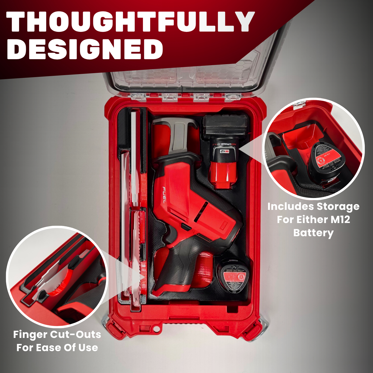 This kit is designed to organize the Milwaukee M12 Hackzall (2520-20) in the Milwaukee PACKOUT Small Parts Organizer (48-22-8435). It will hold plenty of 6, 9, & 12 inch sawzall blades! Visit our YouTube Channel for full tutorials on how to install the included Latches for your new kit!